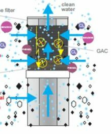 - Kiszűri a vízből az elszíneződést okozó lebegőanyagokat (pl. rozsda, homok, iszap), az organikus anyagokat (pl. baktérium, vírus), mérgeket, valamint a kellemetlen szag- és íz anyagokat.